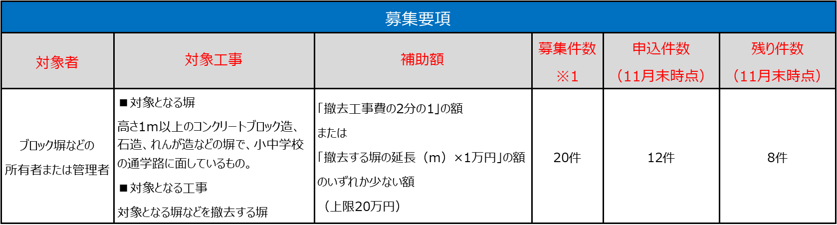 - 市では、小中学校の通学路に面するブロック塀などの撤去に対し、費用の一部を補助します。