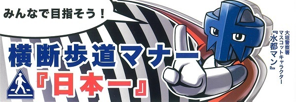 大垣署のマスコットキャラクター「水都マン」がマナー向上を呼び掛けるデザインです