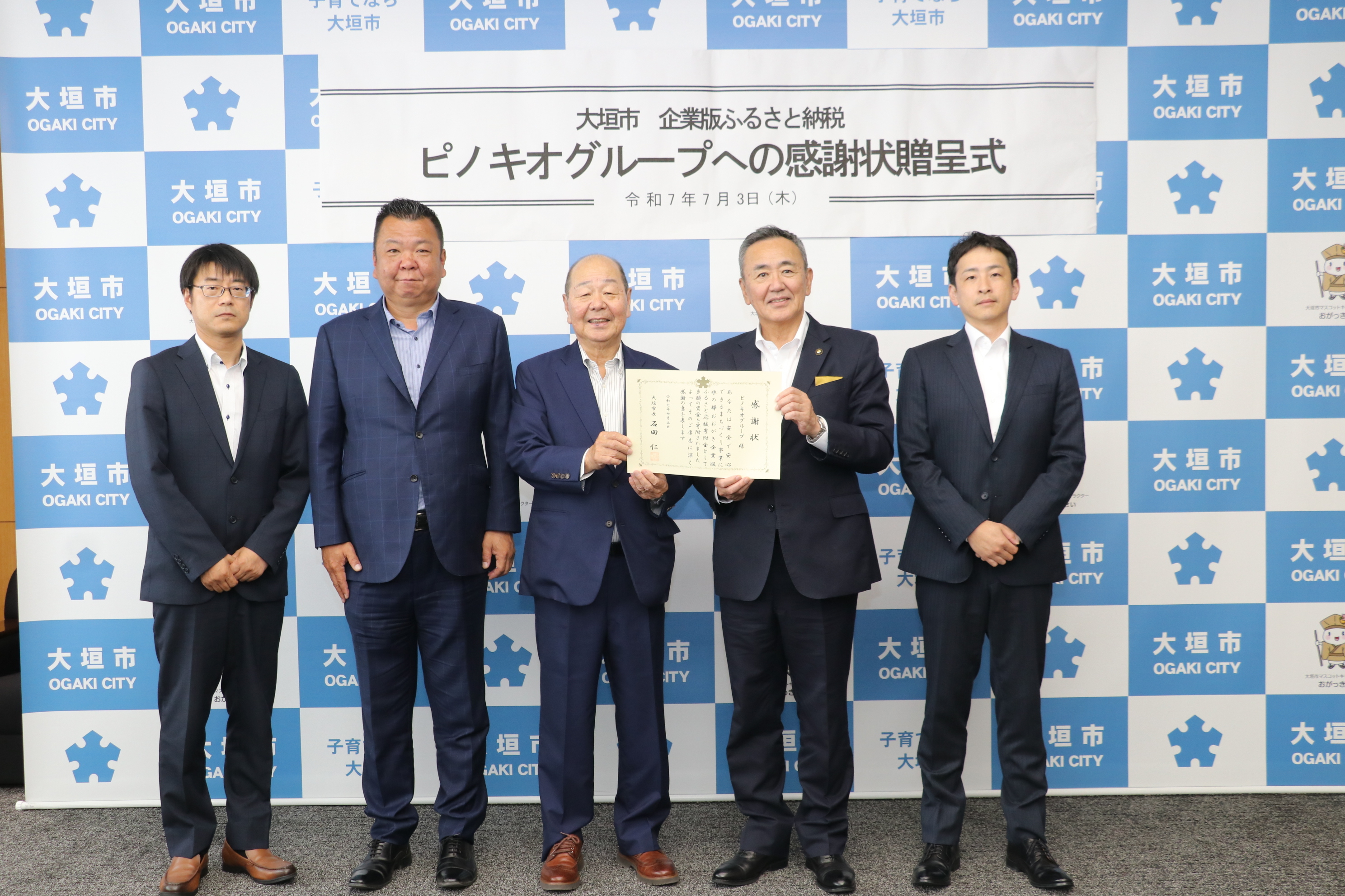 写真左から、ピノキオ商事株式会社取締役執行役員 田中様、専務取締役 石田様、代表取締役 石田様、石田 仁大垣市長、ピノキオ商事株式会社執行役員 加藤様