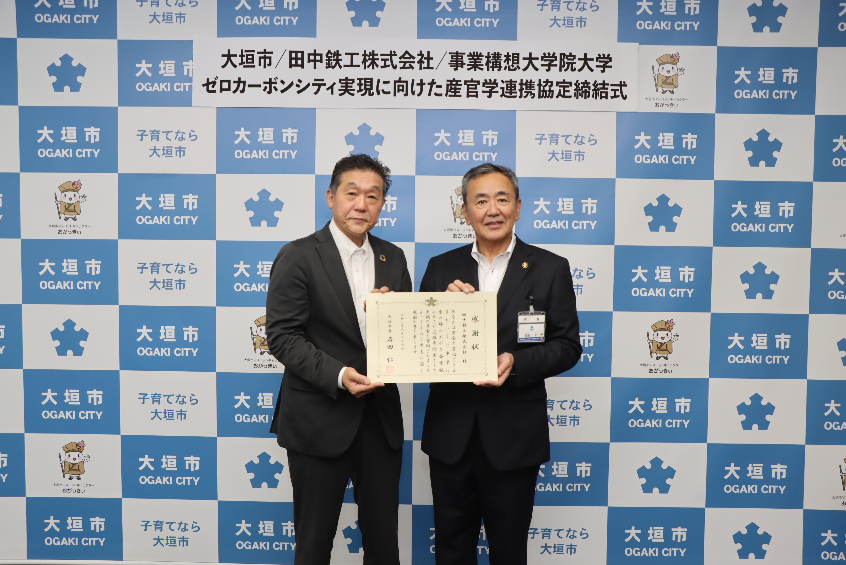 写真左から、田中鉄工株式会社代表取締役CEO 村田 満和様、石田 仁大垣市長
