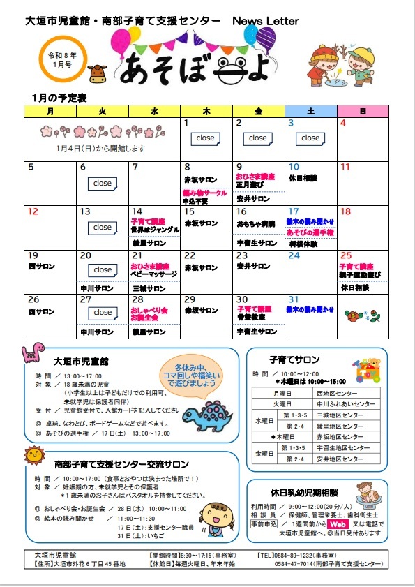 「キッズピアおおがき交流サロン」と「大垣市児童館・南部子育て支援センター」のイベント情報を掲載します。