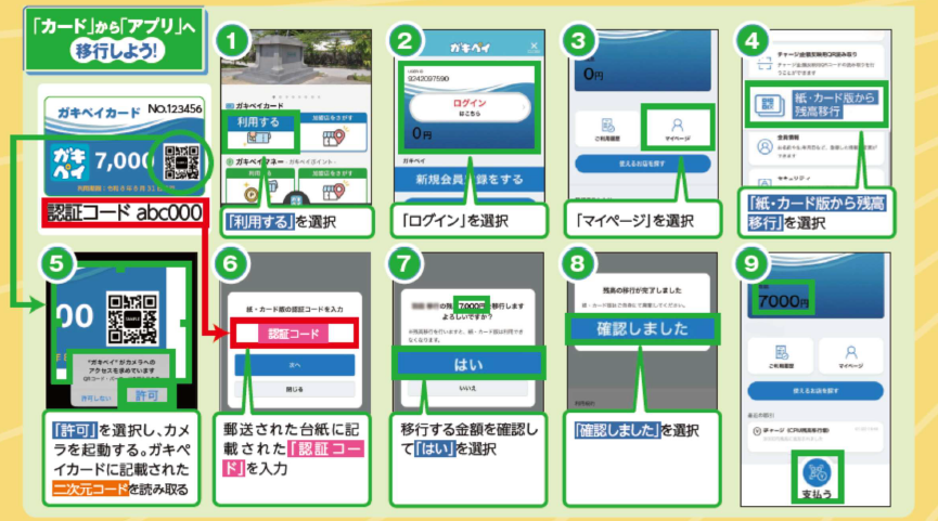 また、スマートフォンをお持ちの方は、「ガキペイアプリ」をダウンロードして、「ガキペイカード」の支払用二次元コードを読み込むと残高移行でき、スマートフォンでのお支払いが可能です。 ぜひこの機会にガキペイアプリの登録をお願いします。