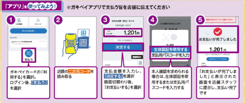 ガキペイカードは、対象店舗で支払いができる他、ガキペイアプリを利用して支払うこともできます。