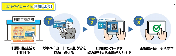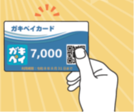 ガキペイカードは、支払用二次元コードが印刷されたカードで、スマートフォンをお持ちでない方でも、対象店舗で提示していただくと7,000円分のお支払いができます。