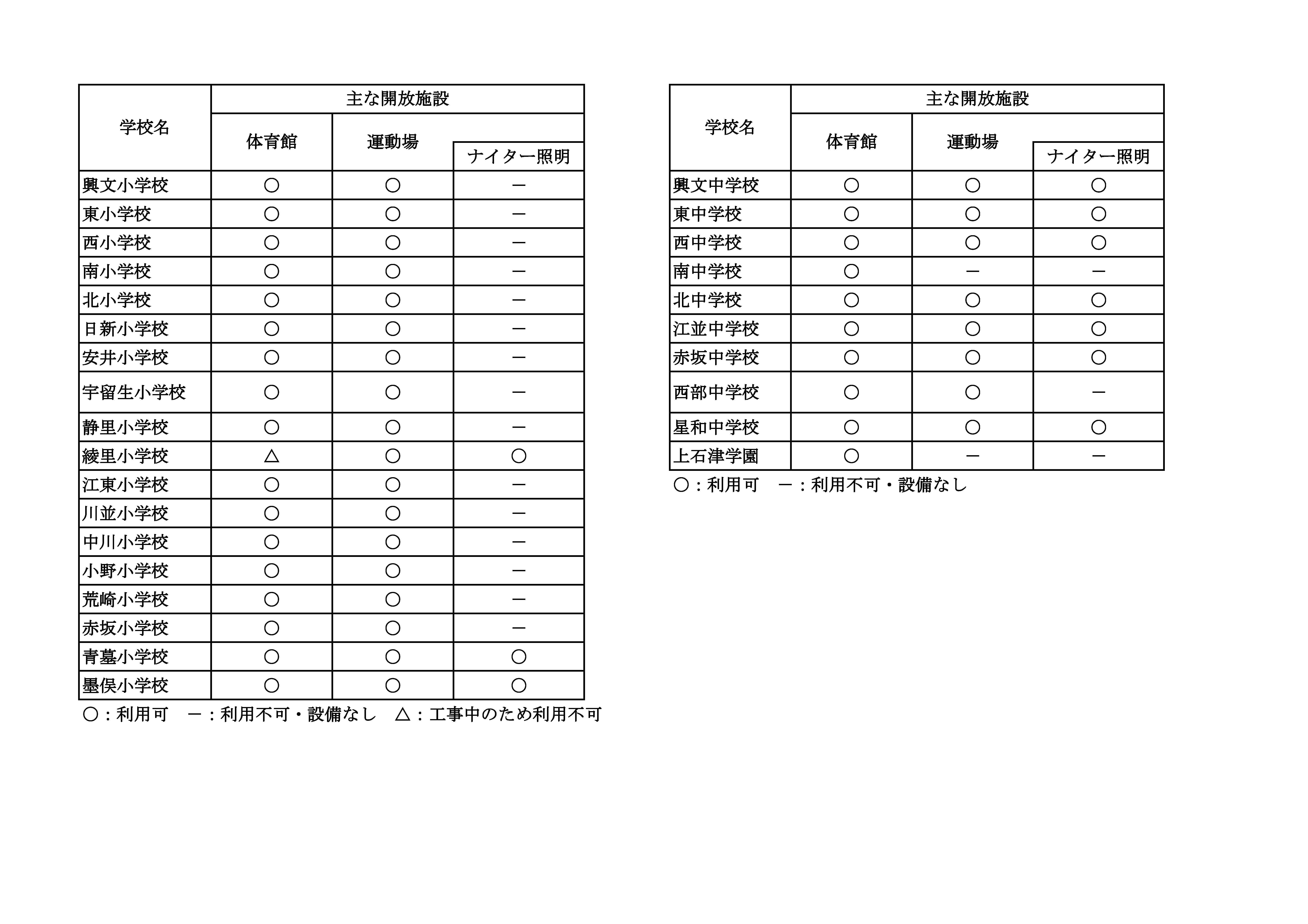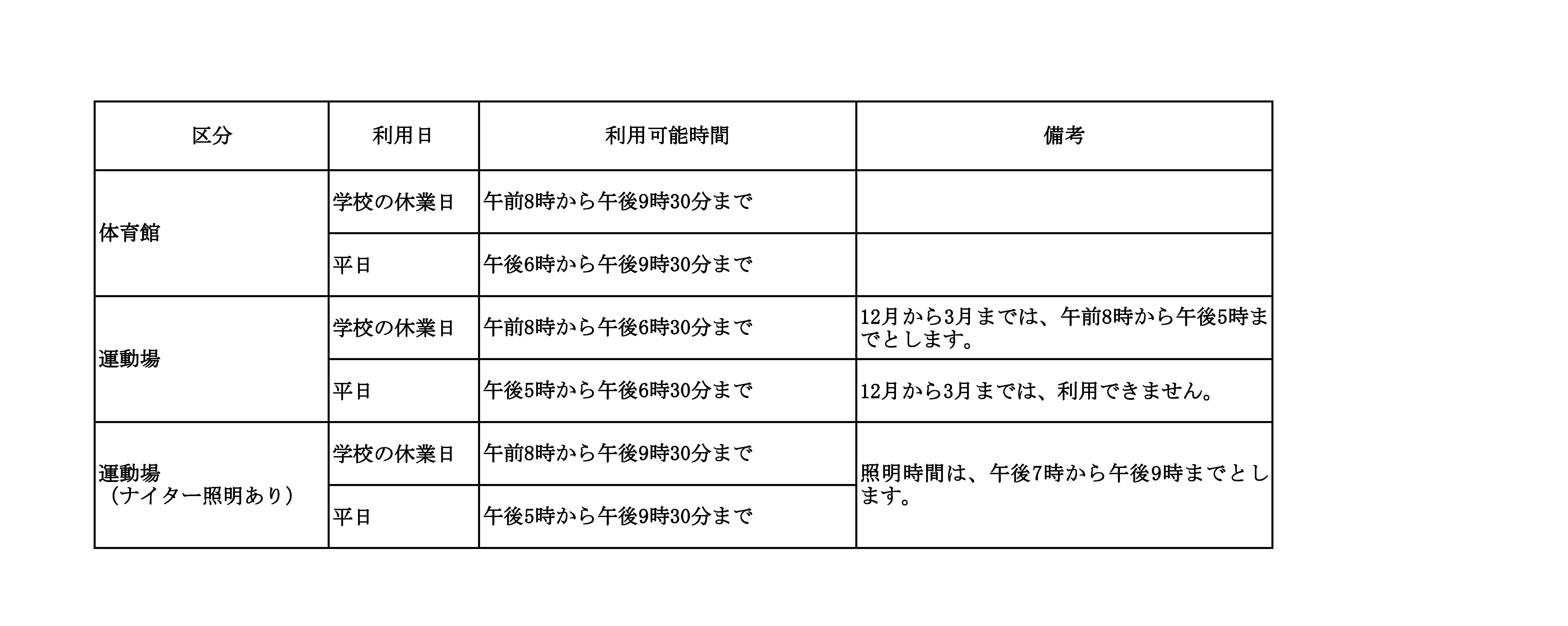 学校開放施設として利用できる施設の主なものは、次のとおりです。